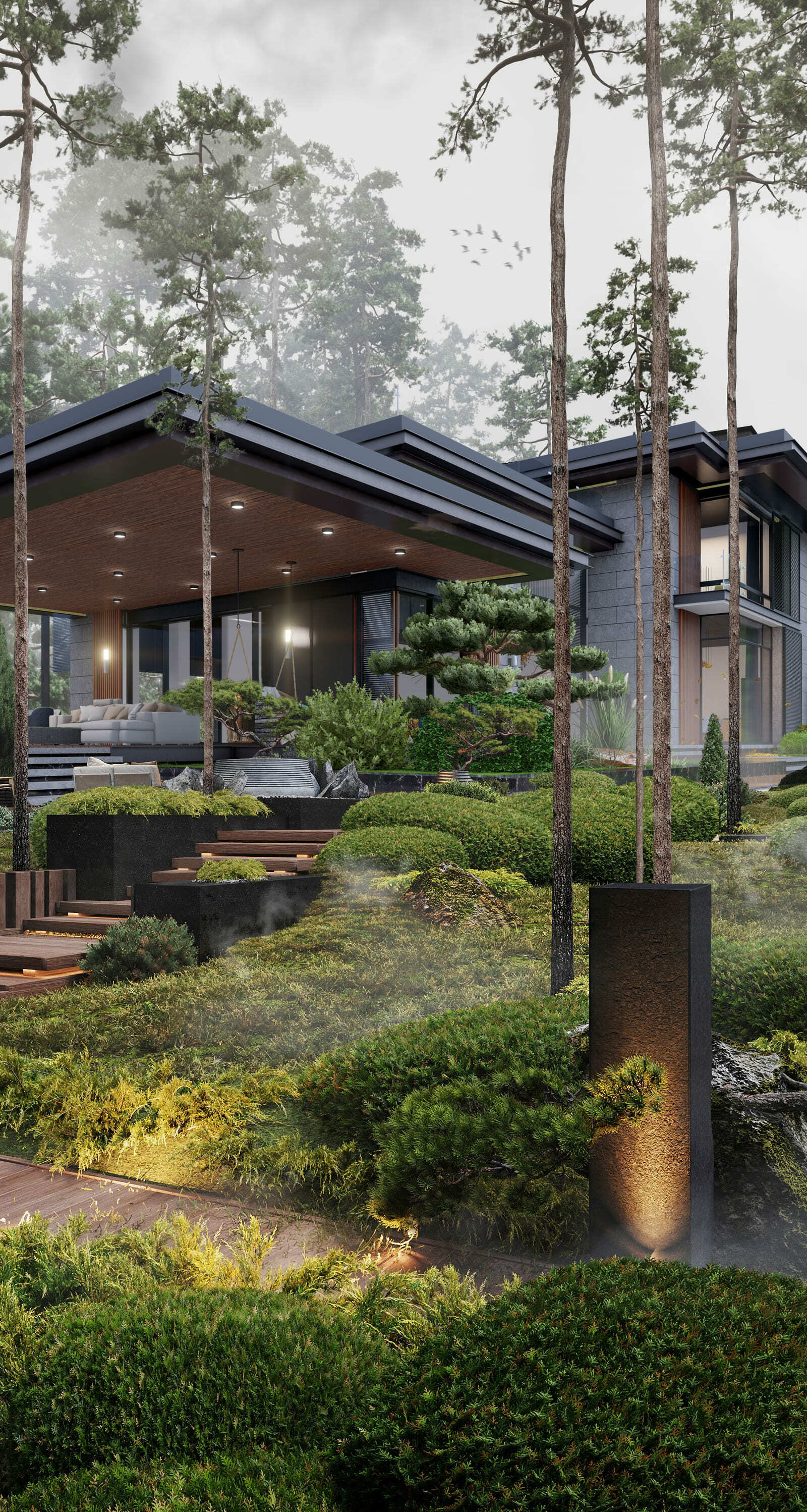 Дом находится на склоне, в окружении шикарного леса. Арихтектура самого дома и фасад будто бы дополняют окружающую природу и подчеркивают ее сильные стороны.